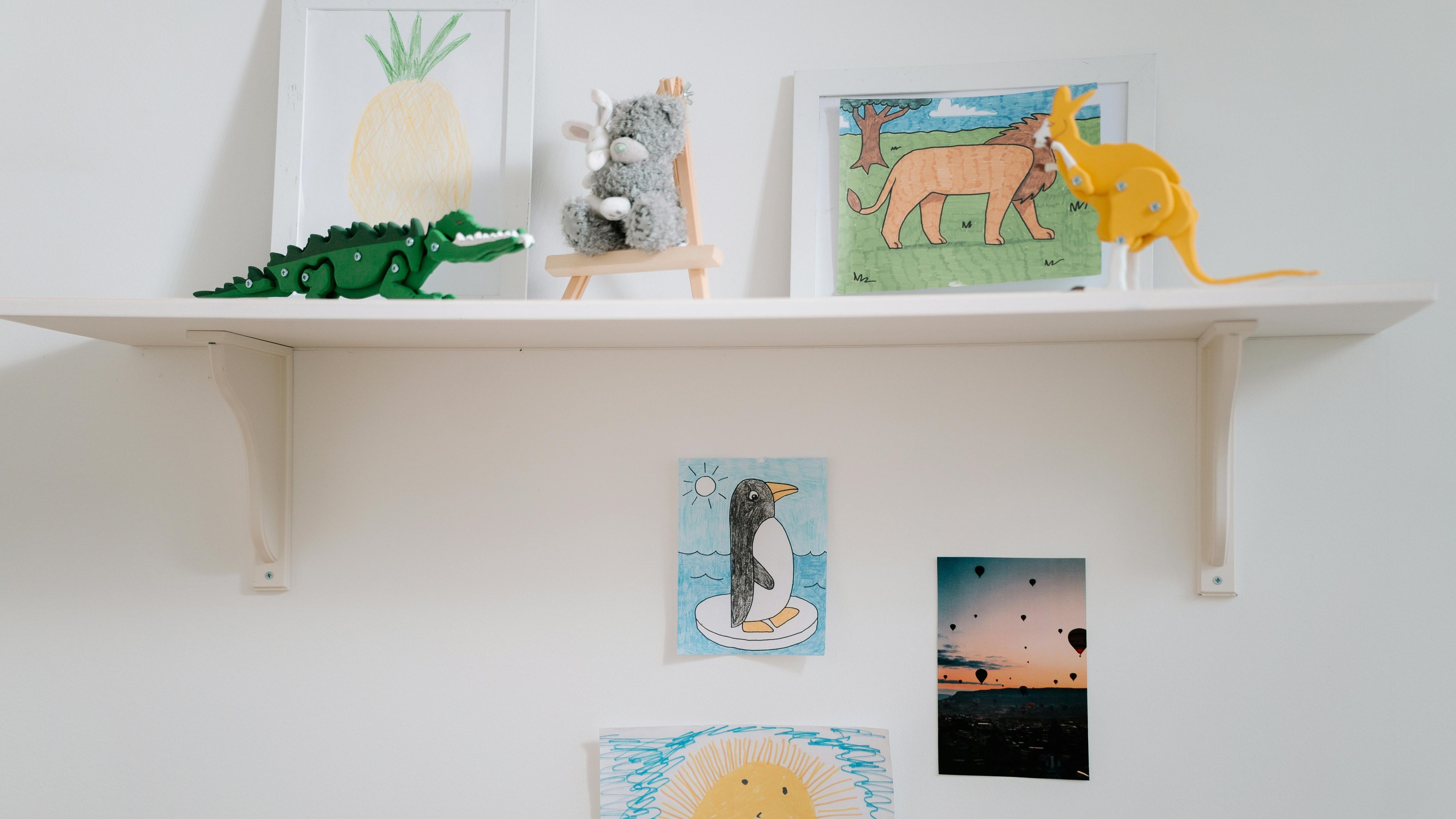 Use os próprios desenhos da criança para decorar. Emoldure as artes mais especiais com molduras baratas ou até mesmo com fita adesiva colorida (washi tape) direto na parede. Essa é uma forma de criar uma decoração afetiva, única e com custo quase zero, além de valorizar a criatividade do seu filho.