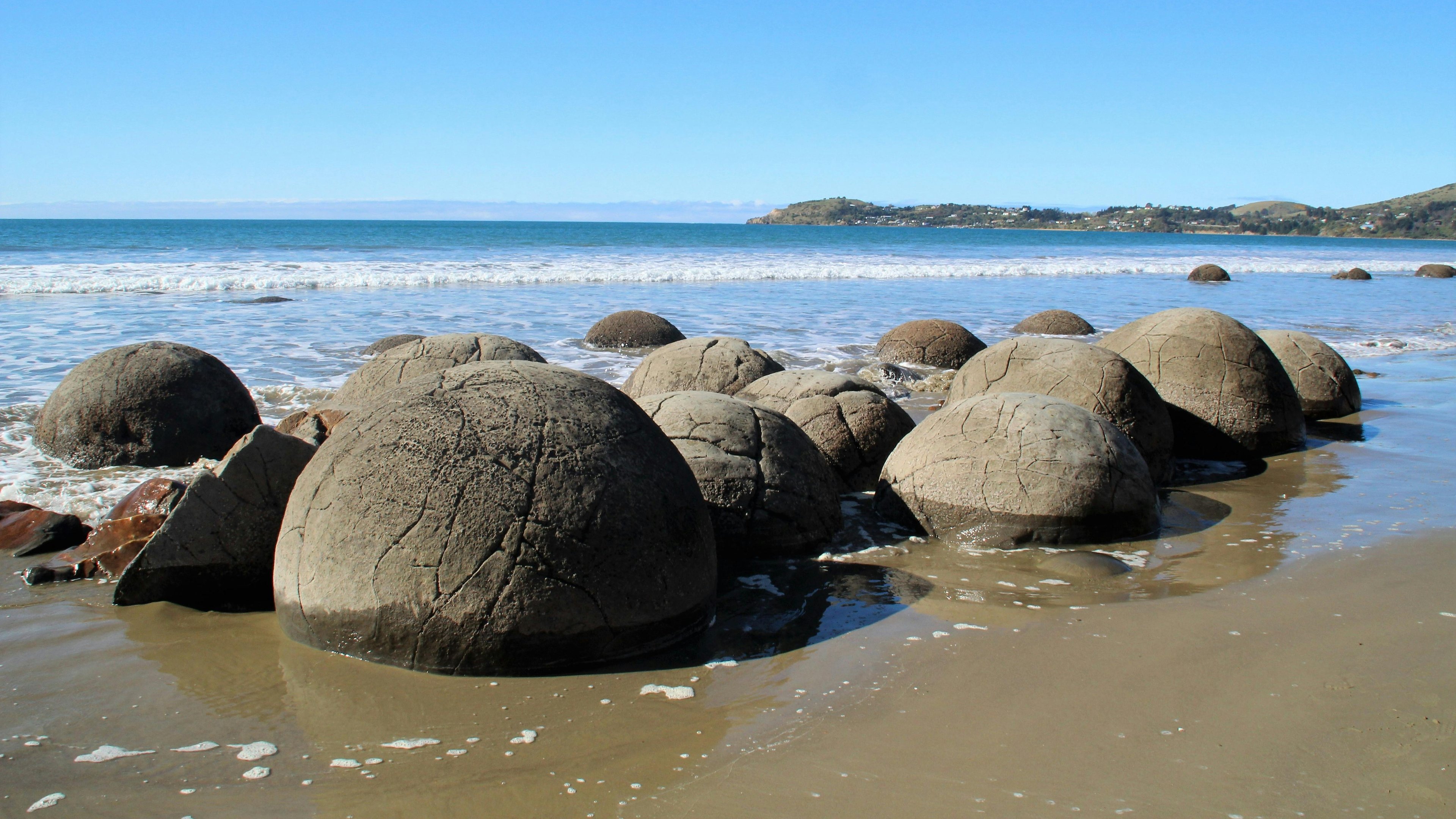 O que torna esta praia exótica são as Moeraki Boulders, rochas gigantes e quase perfeitamente esféricas espalhadas pela areia. Formadas ao longo de milhões de anos por um processo de sedimentação no fundo do mar, essas pedras intrigam visitantes e geólogos. Algumas estão intactas, enquanto outras se partiram, revelando um interior oco. O cenário misterioso atrai fotógrafos do mundo todo.