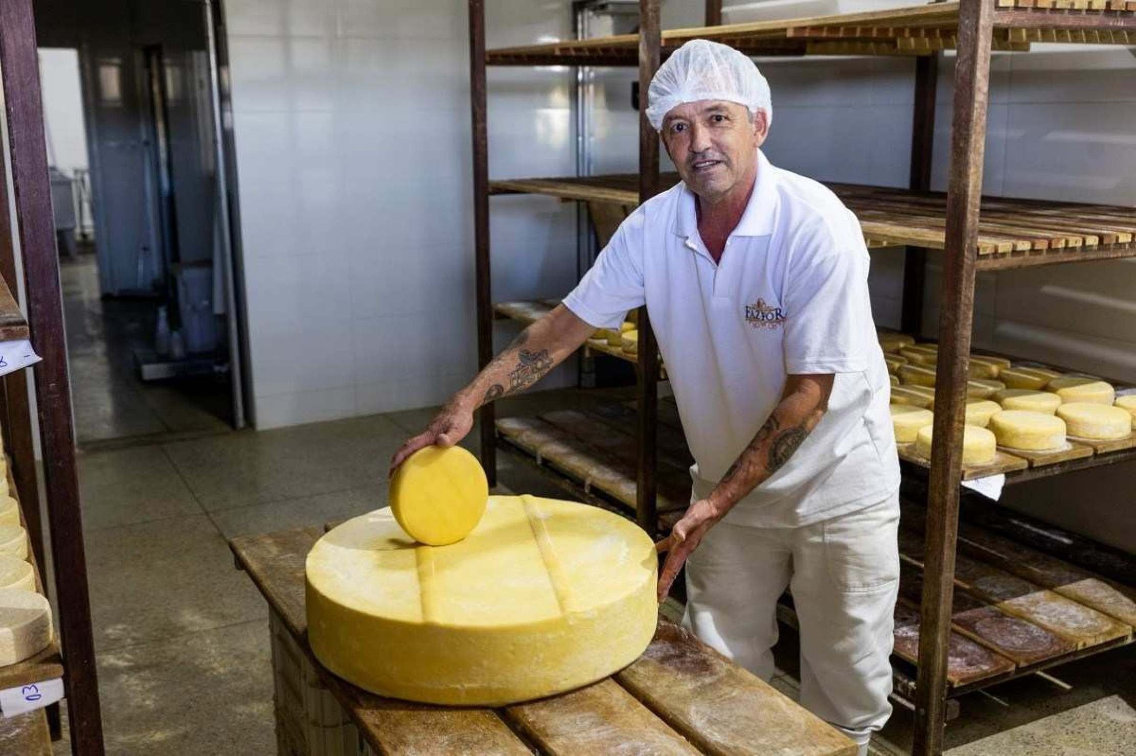 Em uma história que se repete na região, a Fazenda Fortaleza também investiu no ressurgimento da técnica artesanal, após passar anos vendendo leite unicamente para cooperativas e laticínios, que produzem laticínios pasteurizados. Para isso, trouxe um mestre queijeiro da Região da Canastra. Sem esconder o orgulho, Roberto Carlos Soares, o Robertinho, conta detalhes sobre os produtos Fazfor, feitos no local, fala sobre os prêmios que já ganhou e mostra um queijo gigantesco, que demandou cerca de 630 litros de leite. "Eu ainda não pesei esse queijo, mas ele deve ter entre 40 e 50 quilos", avalia.