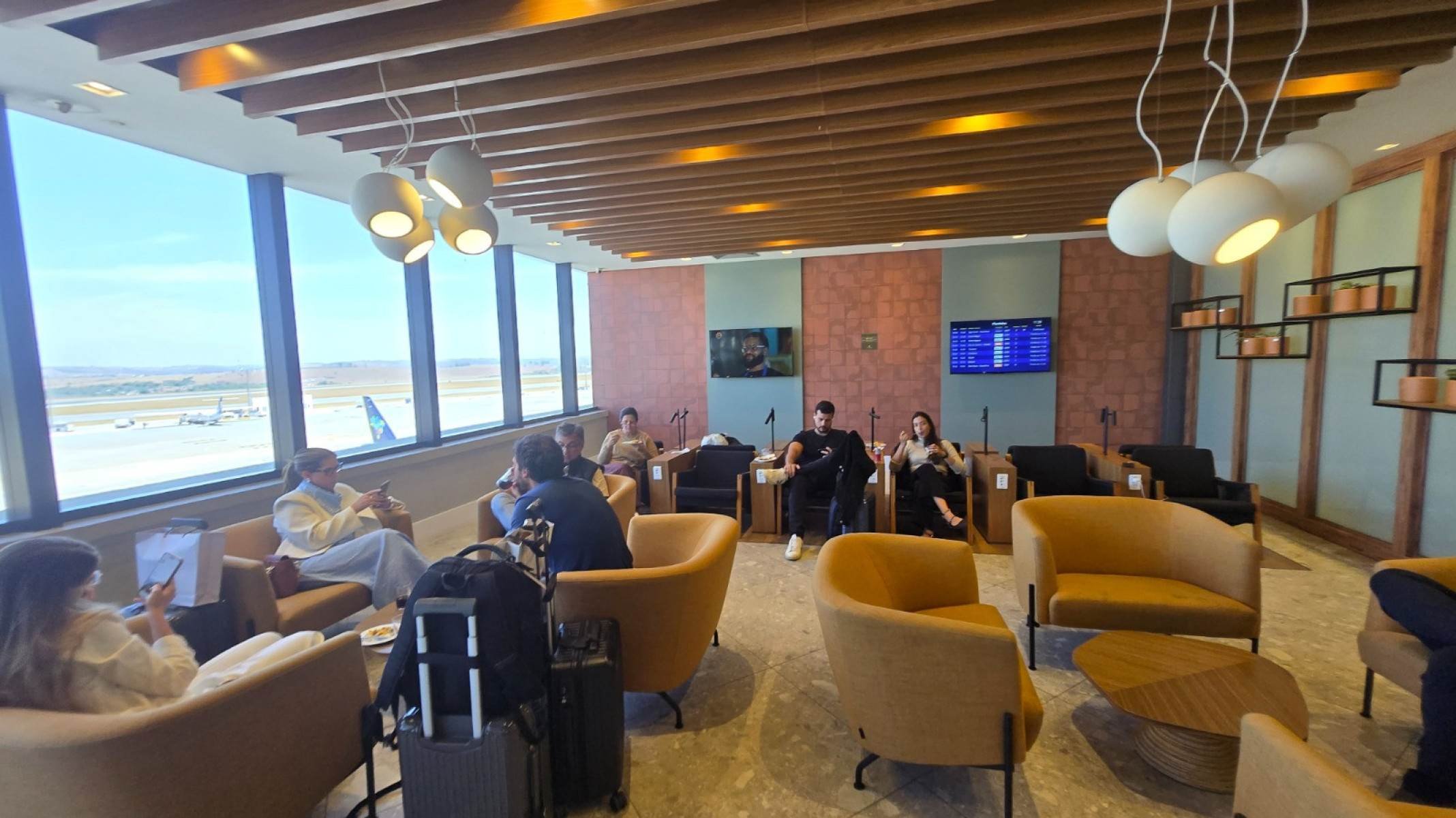 A decoração do espaço também é convidativa com uma vista panorâmica para a pista de pousos e decolagens e um conceito arquitetônico inspirado em Minas Gerais. Além disso, o espaço é equipado com dispositivos tecnológicos e sustentáveis, incluindo iluminação LED inteligente, conectividade Wi-Fi estável, carregadores integrados, painéis digitais para informações, controle de temperatura automatizado e sistemas de som ambiente.