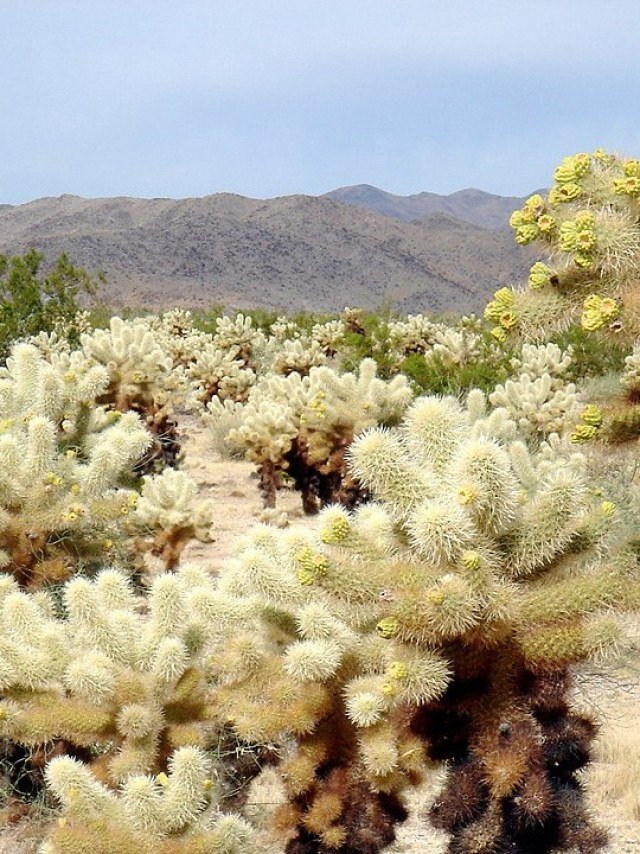 As almofadas apresentam espinhos brancos brilhantes que captam perfeitamente o sol. Esta variedade atinge cerca de 6,0 'de altura, mas se espalha por vários metros.