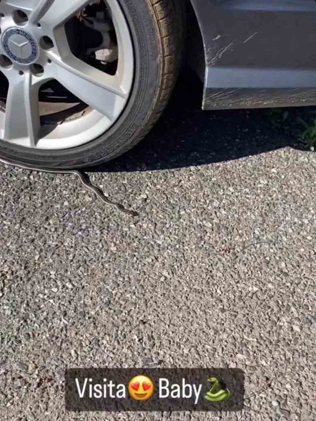 A atriz Ludmila Dayer encontrou uma cobra no pneu do carro, em Los Angele, nos Estados Unidos. E fez um registro para os stories. 'Visita, baby', disse ela.